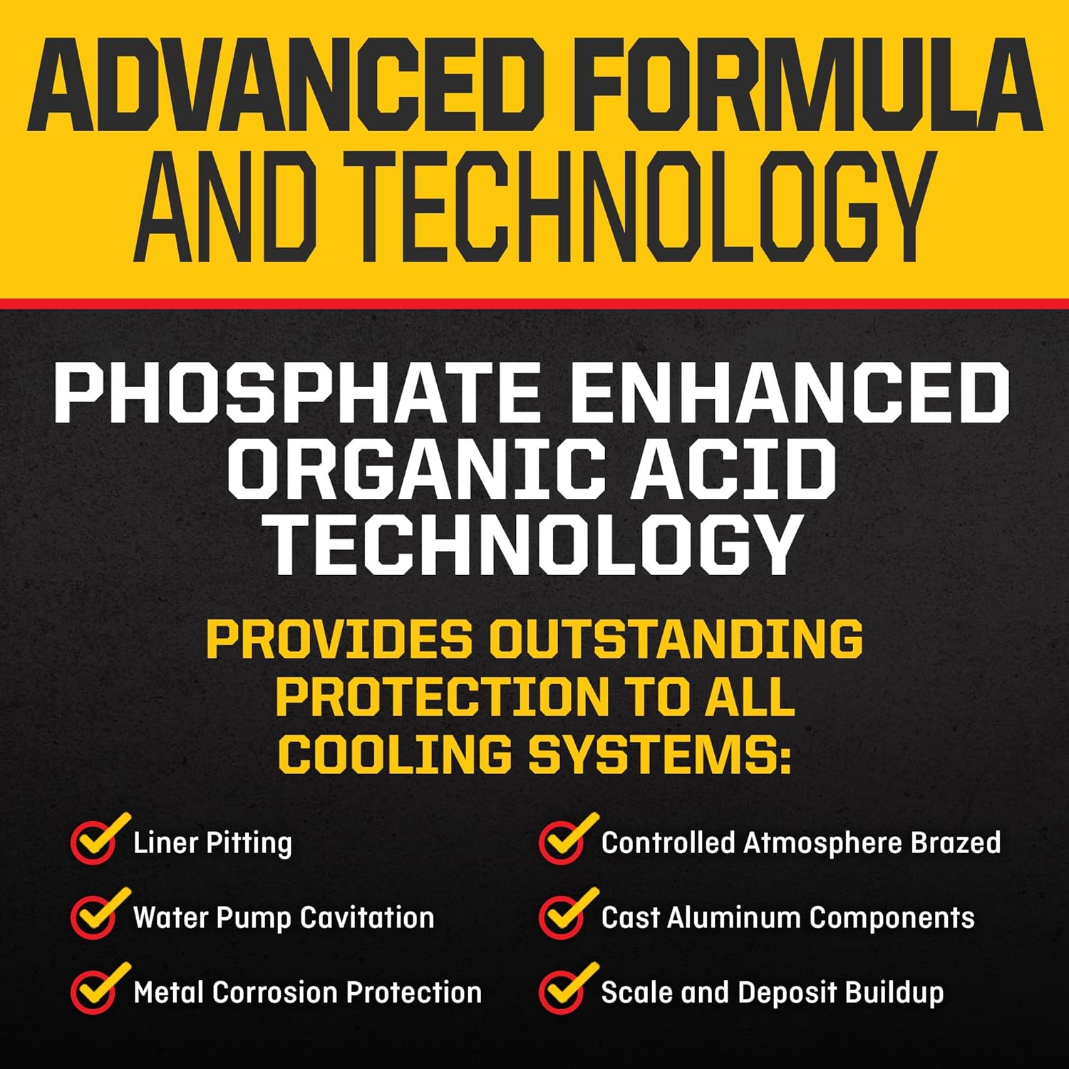 - PHOSPHATE ENHANCED ORGANIC ACID TECHNOLOGY: Provides outstanding liner pitting, water pump cavitation, and metal corrosion protection to all cooling system metals including Controlled Atmosphere Brazed or cast aluminum components